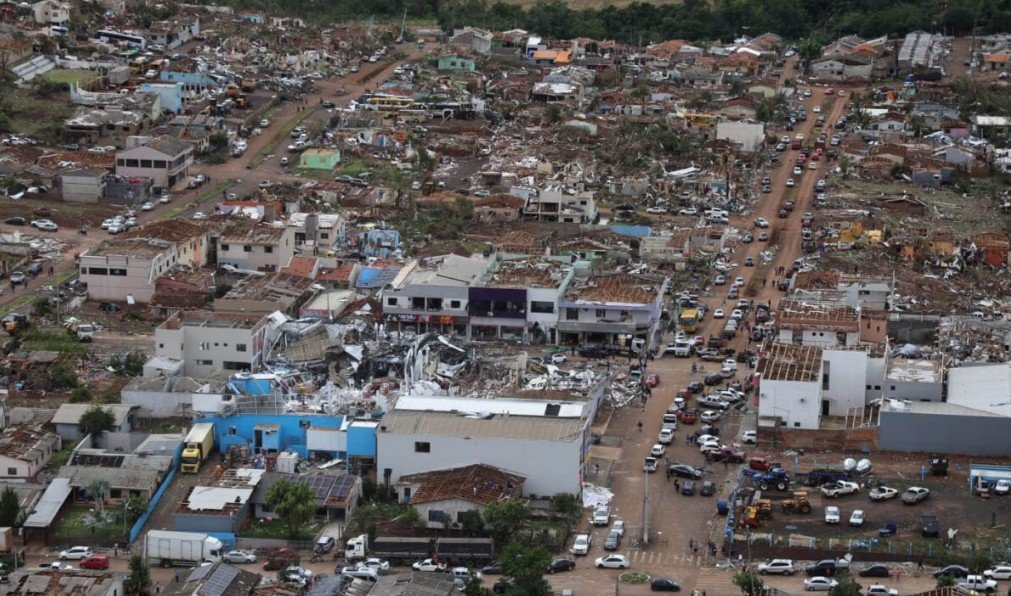 Imagens aéreas mostram a dimensão da devastação causada pela passagem de um tornado no Paraná na noite de sexta-feira, (7). Segundo o governador do Estado, Ratinho Jr (PSD), Rio Bonito do Iguaçu foi a cidade mais afetada, com cerca de 90% de suas construções destruídas. A cidade foi atingida por tornado de nível F-2. Ao menos seis pessoas morreram em razão do tornado, sendo cinco na cidade de Rio Bonito do Iguaçu, localizada a 380 quilômetros de Curitiba. O governador também decretou luto de três dias.